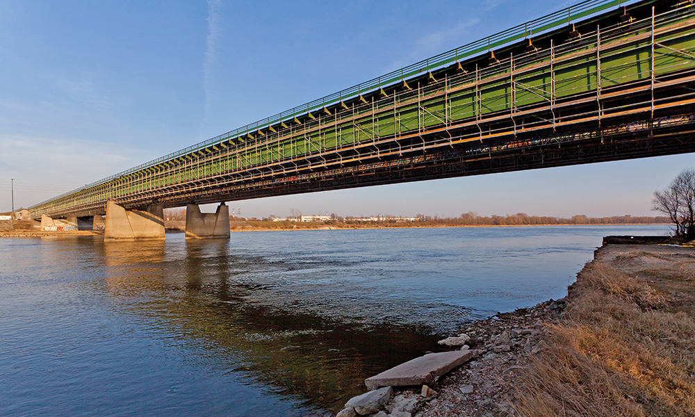 SOLUCIÓN De la viga del puente se instalaron plataformas de trabajo suspendidas. Las actuaciones se llevaron a cabo bajo la vibración y el tráfico constante, de ahí que se reforzaran tanto la parte inferior como superior de las estructuras en ambos sentidos con elementos del andamio BRIO. Suspendidas bajo el vano y dotadas de superficie antideslizante para realizar los trabajos con total seguridad, se crearon plataformas combinando elementos del Sistema MK y del andamio BRIO. Los perfiles IPE actuaron como rieles guía del carro de reparación. La comunicación y la rigidización entre ambas soluciones se realizó con elementos del sistema BRIO.
