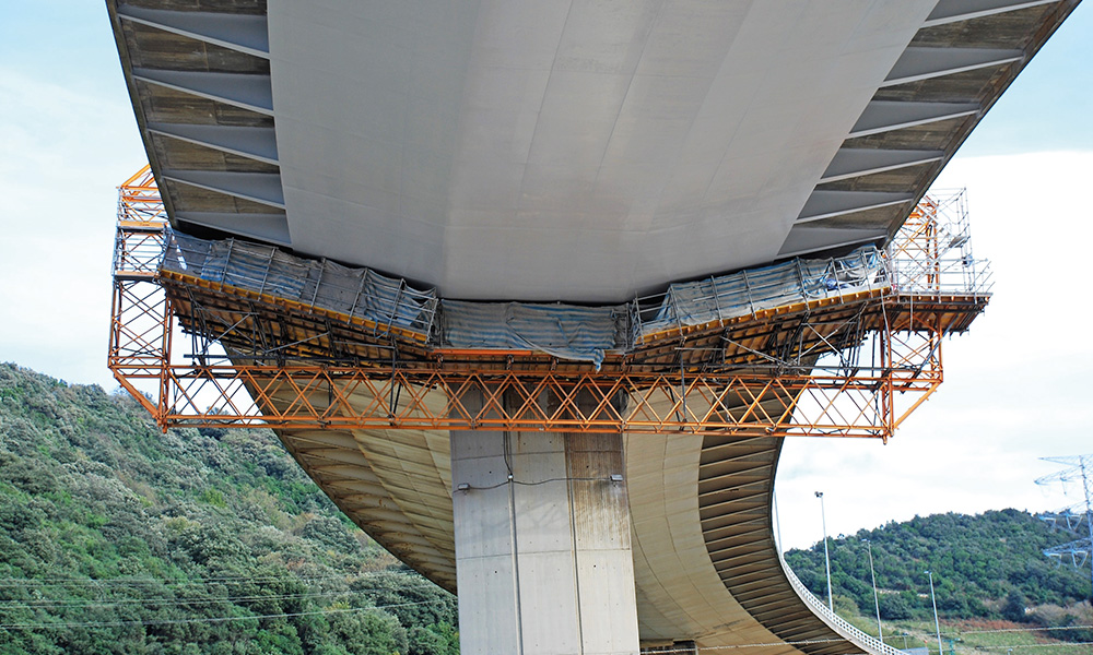 Desde el suelo se han instalado estructuras de andamio en las pilas y en los estribos para permitir el acceso a los operarios en todos los frentes de la obra. Para garantizar la seguridad bajo el puente se montaron dos pórticos de protección de los carriles con torres de cimbra, elementos de andamio BRIO y encofrado de vigas ENKOFORM.
