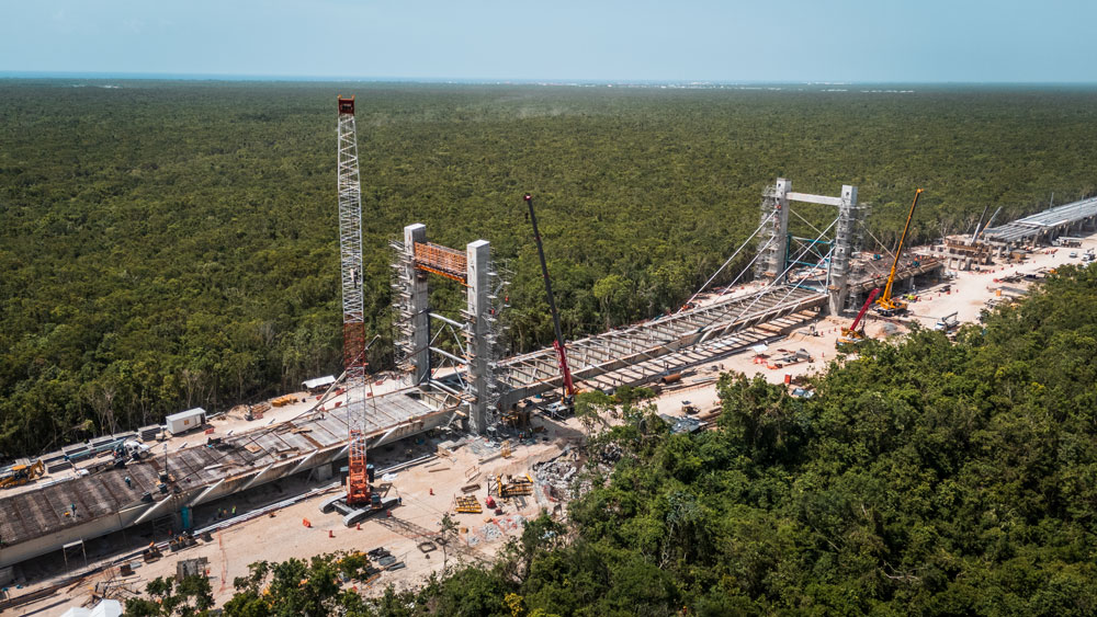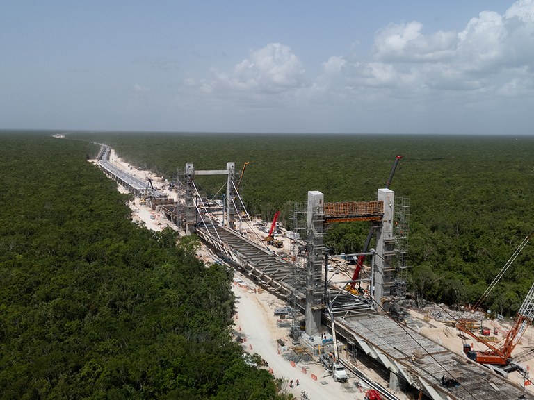 En el Tramo V, la obra presentó retos técnicos significativos debido a la presencia de suelo kárstico. Para superar estas condiciones geológicas, se diseñaron 42,1 km de vía elevada y 25,6 km sobre terraplén. Uno de los elementos más destacados del tramo es un puente atirantado de 266 metros, concebido para preservar la cueva Garra del Jaguar en Tulum. Esta estructura se apoya en dos ejes principales, cada uno formado por un par de pilonos de 33,40 metros de altura, unidos mediante una viga de atado de 17,50 metros. Esta configuración estructural aseguró la estabilidad del puente y permitió proteger el entorno natural sin interferencias.