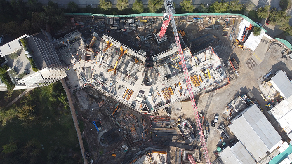 Además de los encofrados especiales, ULMA ha suministrado un conjunto de sistemas que ha permitido mantener el ritmo de obra, asegurar la estabilidad estructural y cumplir con los objetivos de calidad fijados por el cliente. Los encofrados verticales ORMA se han utilizado en los tabiques de los subterráneos, lo que ha proporcionado un alto rendimiento y ha reducido la necesidad de mano de obra. La plataforma interior para huecos KSP se ha colocado en el núcleo del ascensor y ha permitido instalar plataformas de seguridad sobre vacíos, favoreciendo así la movilidad de los equipos. Para las zonas en voladizo del primer nivel se ha empleado Andamio Multidireccional BRIO y torres de puntales de aluminio ALUPROP, una combinación que ha garantizado un apeo adecuado y seguro. Con el encofrado de vigas metálicas BTM se han llevado a cabo las losas de los subterráneos hasta alcanzar el nivel de los columnas tetrápodos.