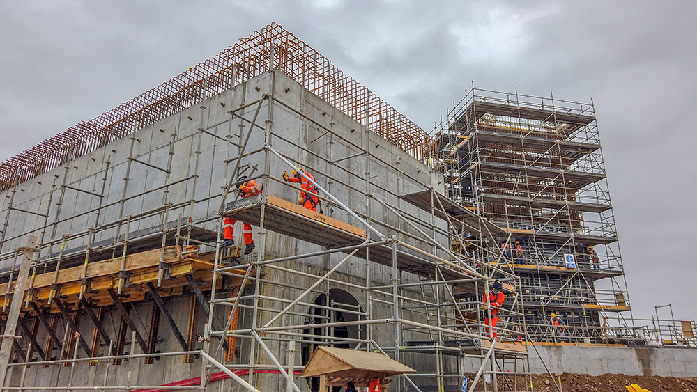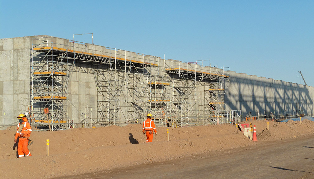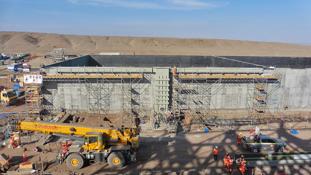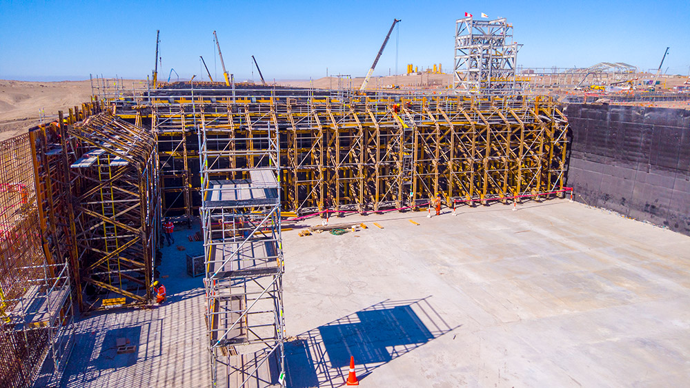 Las estructuras destinadas al almacenamiento o apilado del material y a las operaciones de triturado, están configuradas por una gran cimentación, placas y losas pesadas que presentan una geometría rectangular en planta. Tanto la ejecución de la cimentación como de los tabiques, se ha realizado mediante el sistema de encofrado modular ligero LGW, utilizando la barra roscada DW15 para soportar la presión ejercida por el hormigón. La estructura para el almacenamiento de material o stockpile comprende dos niveles de tabiques y losas. Las consolas BMK se han empleado para sostener el encofrado de tabiques y el anillo exterior, además de ofrecer plataformas para habilitar espacios de trabajo seguros.