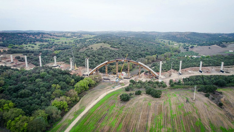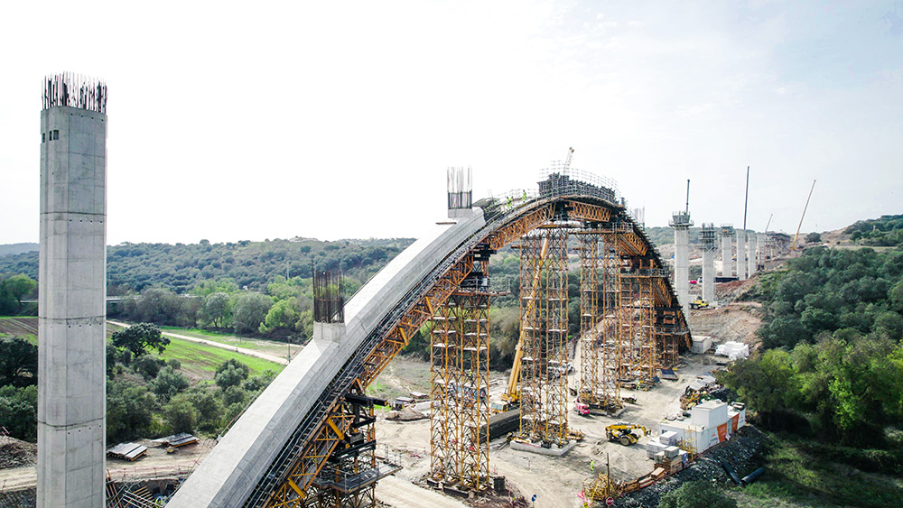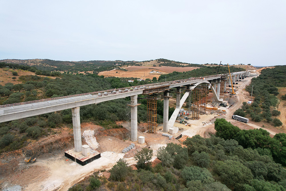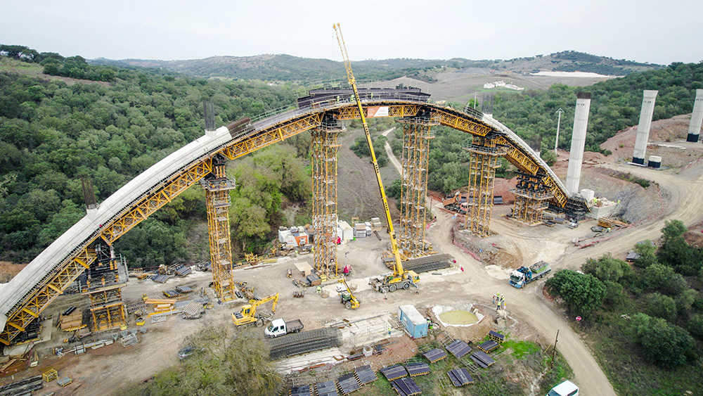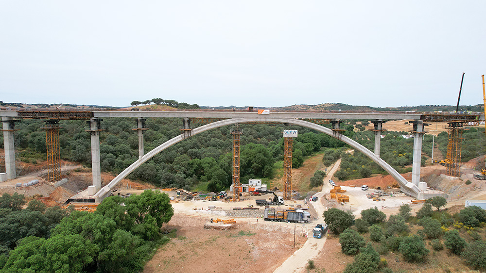“La parte más compleja de la construcción de este viaducto es, sin duda, el arco. Debido a su proceso constructivo, adaptamos el sistema de torres T-500, de gran tonelaje, con cerchas H-33 que permiten salvar grandes luces. De esta forma, ubicamos estas torres en los lugares idóneos para colocar gatos hidráulicos que nos permitieran corregir las alturas de los dos semiarcos. Finalmente realizamos una viga central donde se tensa y comprime el arco para luego poder atirantarlo sin problemas de introducir cargas no previstas”, comenta Nuno Filipe, Director de Obra, Construgomes Engenharia.